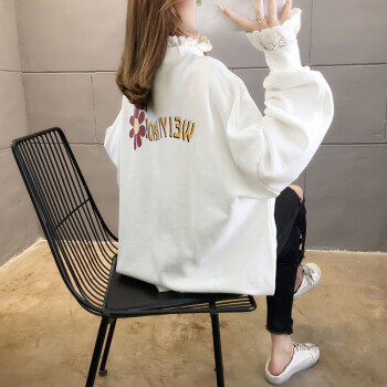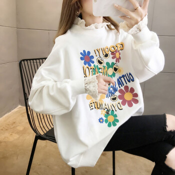 卡赫希卫衣女2020春秋季新款时尚休闲宽松韩版潮ins春秋装蕾丝百搭薄款假两件上衣女5002 白色 请拍正确尺码 |