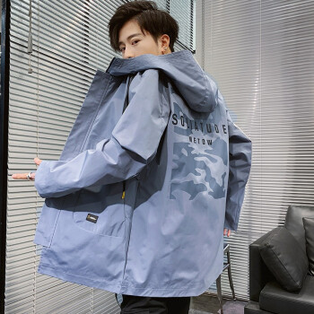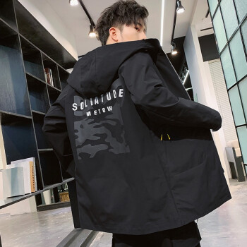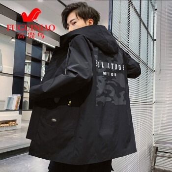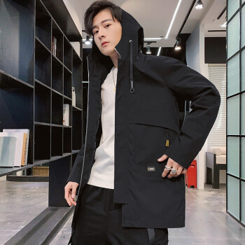 富贵鸟风衣男中长款外套2020春秋天青年时尚宽松连帽工装夹克男大码韩版加绒加厚潮流帅气时尚褂子上衣男 黑色薄款 XL(125-140斤) |