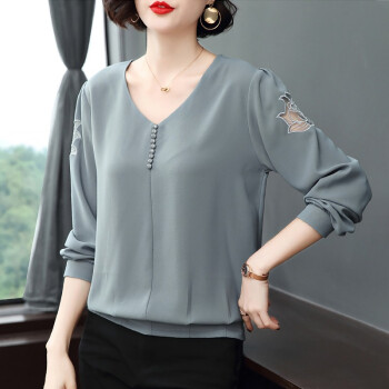 【精选好货】晞薇雪纺上衣2020新款春夏装时尚简约打底衫中年妈妈大码长袖T恤女洋气小衫遮肚宽松 浅灰蓝 请拍正确尺码 |