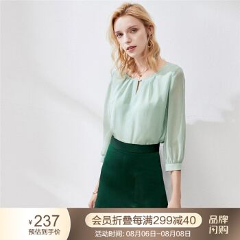 颜域薄荷绿圆领雪纺衫女2020新款秋装减龄宽松显瘦七分袖气质上衣 浅绿 M |