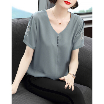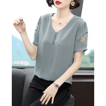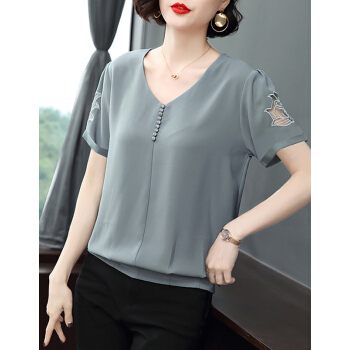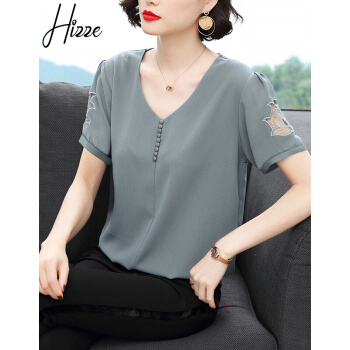 【精选好货】Hizze短袖雪纺衫女2020新款夏装时尚洋气雪纺上衣大码中年妈妈装碎花遮肚小衫T恤夏 浅灰蓝 请拍正确尺码 |
