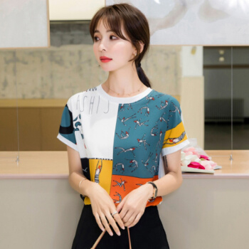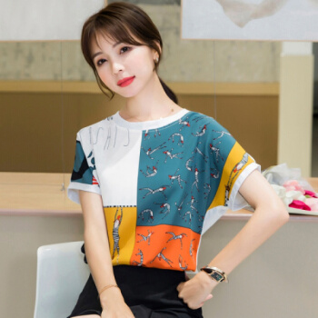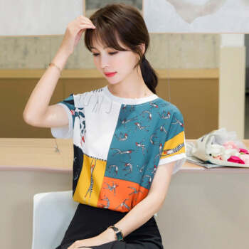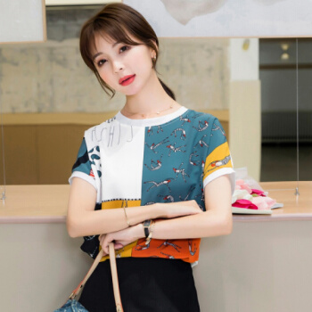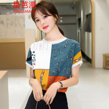 星芭漫 雪纺衫短袖女2020夏季新款上衣印花宽松薄款圆领拼接T恤衫#1049 花色 M |