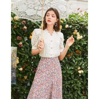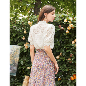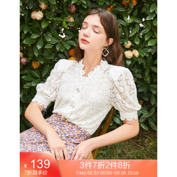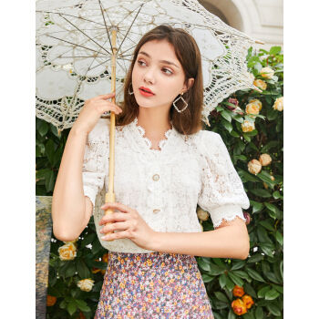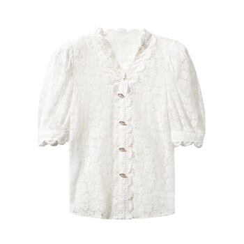 三彩2020秋季新款花边V领花朵蕾丝直筒复古泡泡袖中袖衬衫上衣女 白色 170/92A/XL |