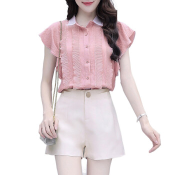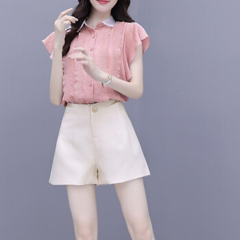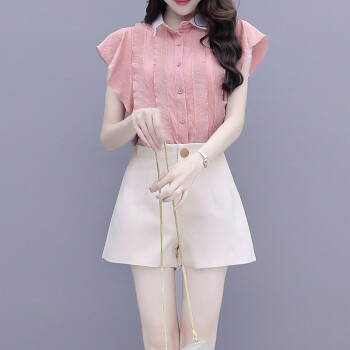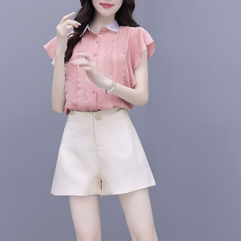 灏尼欧 雪纺衫套装女夏装新款2020年小个子显高洋气减龄休闲短裤子两件套 粉色套装 M |