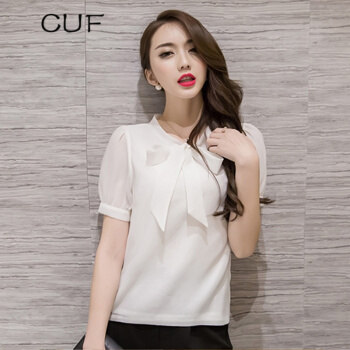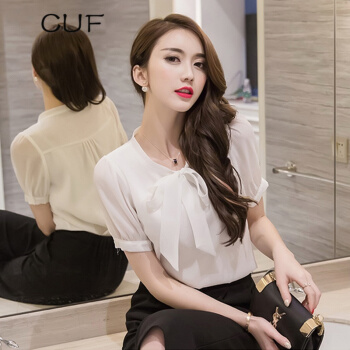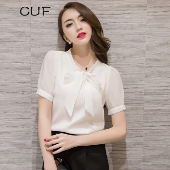 CUF 香港潮牌 雪纺衬衫女装2020年夏季新款V领蝴蝶结职业上衣纯色显瘦短袖打底衫百搭气质 白色 S |