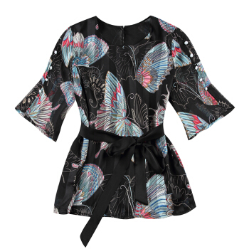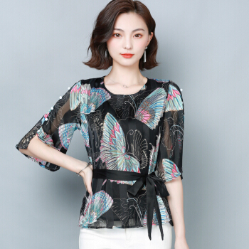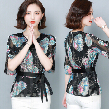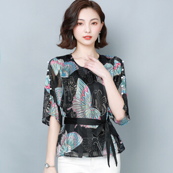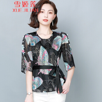 雪姬莲 雪纺衫女短袖2020夏装新款上衣系带显瘦衬衫女印花遮肚洋气小衫#6924 黑色 L |