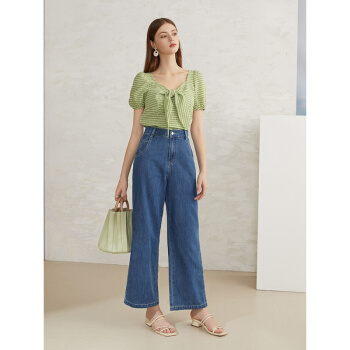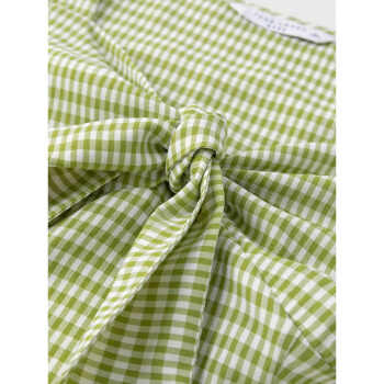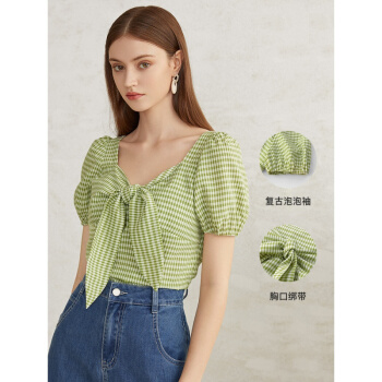 范思蓝恩 2020夏季新款复古泡泡袖雪纺衫女设计感小众胸前绑带上衣 青格纹 L |