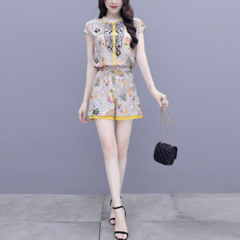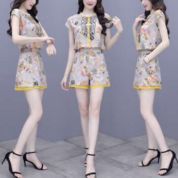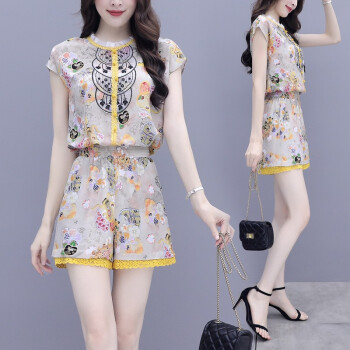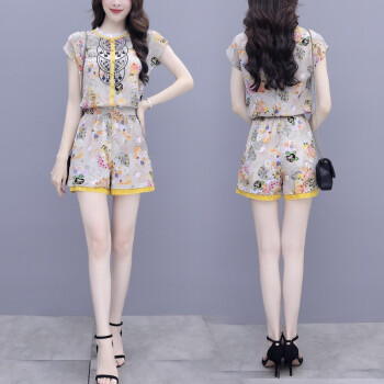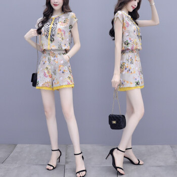 双合依恋 2020新款女装夏季职业装两件套裤复古宫廷风刺绣雪纺衫上衣阔腿短裤休闲时尚套装女 8380 黄色套装 M |