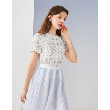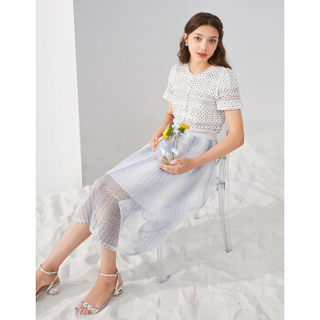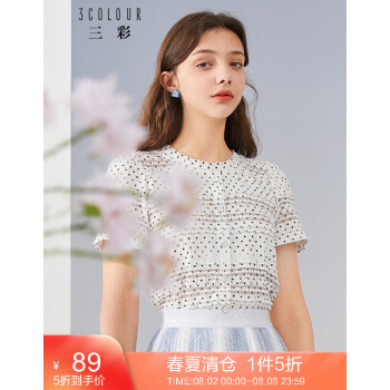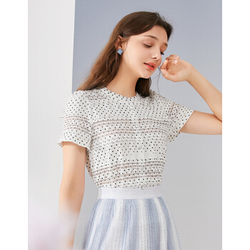 三彩2020夏季新款圆领短款直筒波点蕾丝印花单排扣短袖衬衫女 白色 155/80A/S |