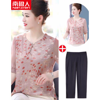 南极人 妈妈装套装2020夏季新款洋气雪纺小衫50岁中老年短袖女士上衣大码两件套 N3-NRA76-9246-套装皮粉 XL 建议95-110斤穿 |