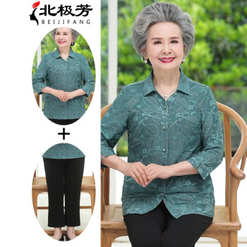 北极芳 妈妈装中袖衬衫60-80岁中老年女装老太太奶奶装夏装上衣两件套装翻领衬衣104-QH2021 绿色套装 2XL【105-120斤】 |