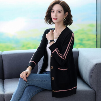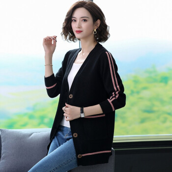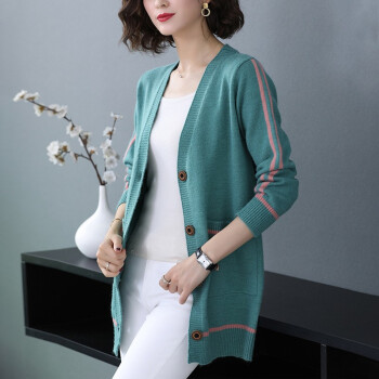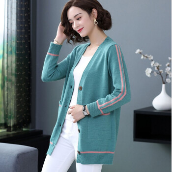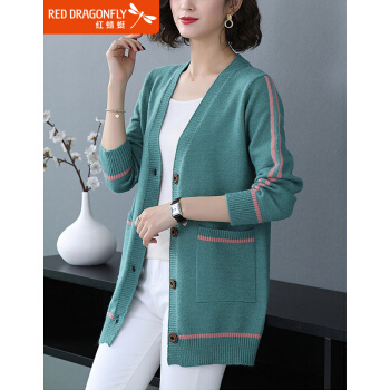 红蜻蜓 针织衫女2020春秋季新款女装中长款开衫宽松大码V领针织毛衣上衣外套女 9960 绿色 M |