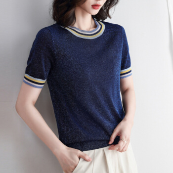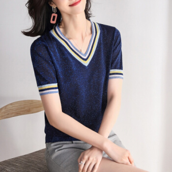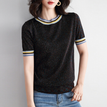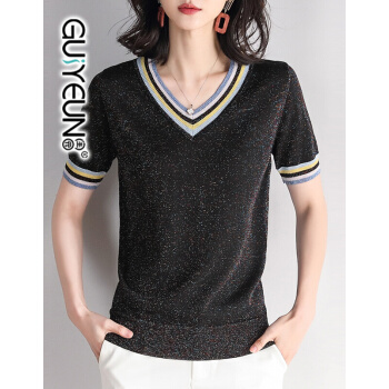 闺园(GUIYUAN)针织衫女2020夏季冰丝女士薄短袖上衣T恤宽松v领亮丝短款打底衫内搭 黑色 请拍正确尺码 |