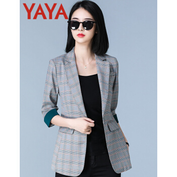 鸭鸭服饰yaya小西装女2020女装秋季新款外套女春秋流行韩版女百搭上衣七分袖 咖啡格 L |