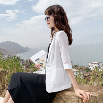 樹染潮牌亚麻小西装女薄款透气防晒衣中长款2020夏季新款修身休闲韩版百搭棉麻职业西服大码外套 白色(七分袖) M 体重98至107斤 |