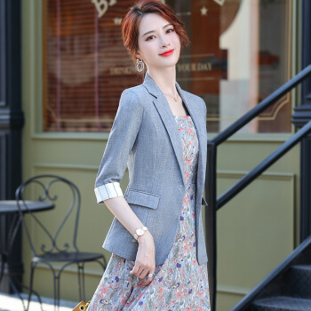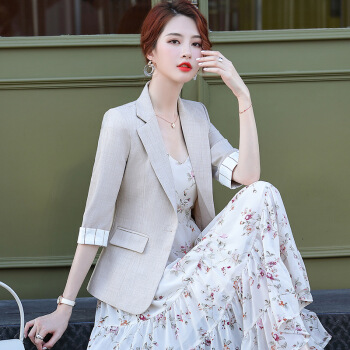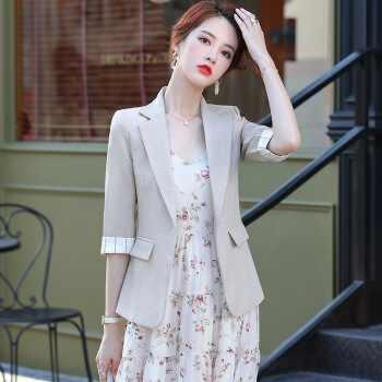夏天潮流新品 蓝色小西装外套女韩版2020夏季薄款条纹英伦修身时尚职业西服上班可穿 杏色西装 S |