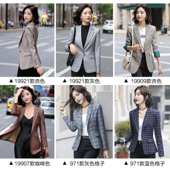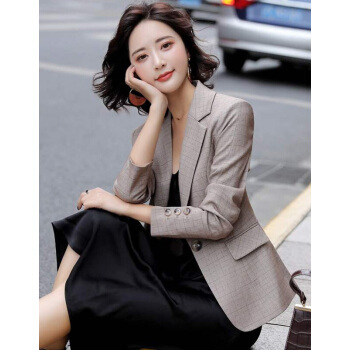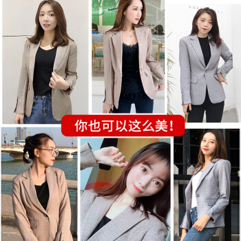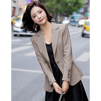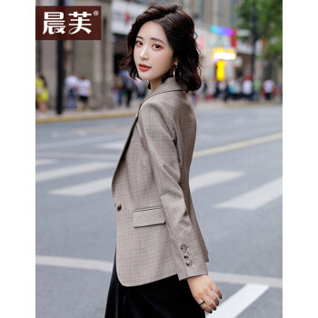 晨芙小西装女长袖休闲格子外套2020秋冬款气质修身英伦风网红款韩版显瘦短款小个子复古西服女上衣潮 19921杏色外套 L |