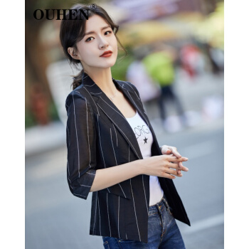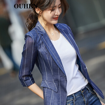 OUHEN高端品牌女装 亚麻小西装外套女2020新款夏薄款休闲小个子韩版条纹西服上衣 蓝色 M |