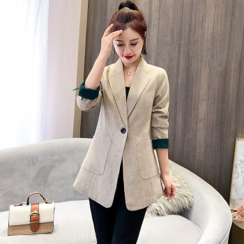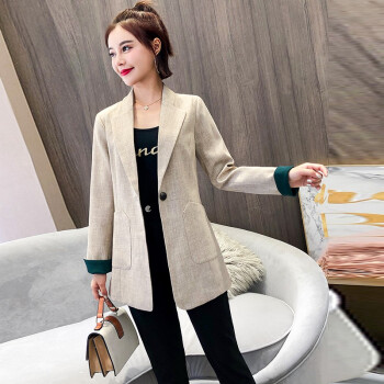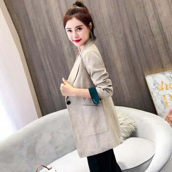 简草 小西装女中长款2020秋季新款时尚潮流宽松显瘦气质休闲韩版长袖一粒扣西服外套女Z911 米色 S |