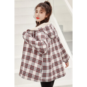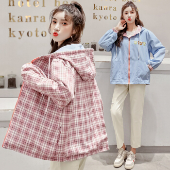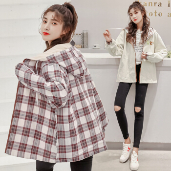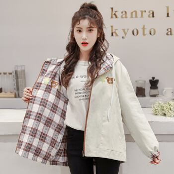 两面穿盐系外套少女秋季2020新款初中学生韩版宽松日系格子上衣 杏色 M |