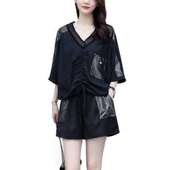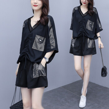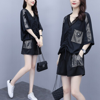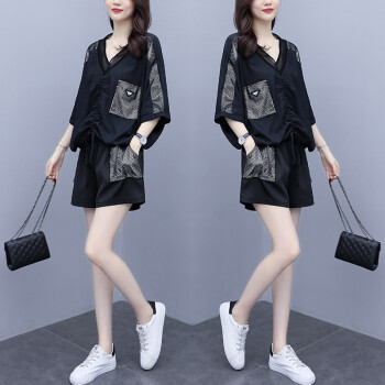 芷依丽 时尚大码胖MM套装女2020夏季新款宽松短袖上衣女T恤休闲阔腿短裤运动两件套 黑色 L |