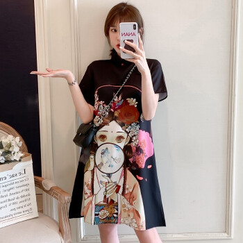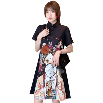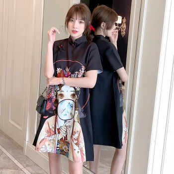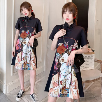 可馨怡 大码女装微胖mm连衣裙夏装旗袍改良胖妹妹加肥加大码胖人女装显瘦款遮肚肉裙子2020 黑色 XXXL(建议150-175斤左右) |