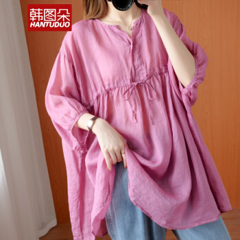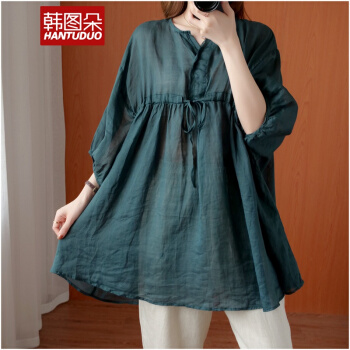 韩图朵胖妹妹mm大码衬衫女2020夏装新款棉麻衬衣短袖宽松上衣3068 墨绿色 大码均码 |