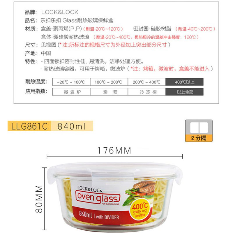 分隔耐热玻璃保鲜饭盒 840ML【玻璃/透明】 |
