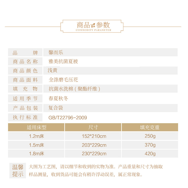 雅美抗菌夏被(被芯1件)(适合1.5米床)【面料:聚酯纤维;填充:聚酯纤维/浅黄】 |