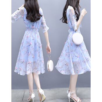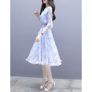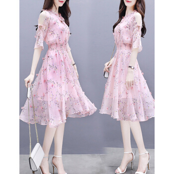 欧芙伦碎花雪纺连衣裙女2020夏季新款韩版时尚气质显瘦减龄收腰中长款裙子女5935 粉色 M |