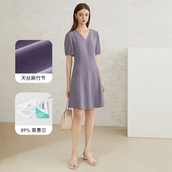 范思蓝恩 2020新款夏季泡泡袖V领连衣裙收腰显瘦气质女神范a字裙 紫色 L |