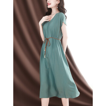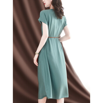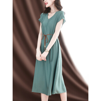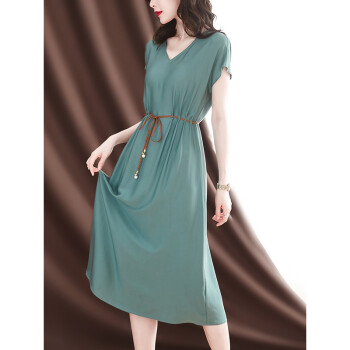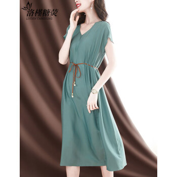 洛槿糖荧 真丝连衣裙女2020夏新款v领收腰显瘦气质女神范温柔风桑蚕丝女装裙子 蓝色 M |