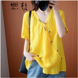 姗朴 棉麻衬衫女民族风2020夏季新款文艺复古大码女装胖mmV领盘扣宽松显瘦斜襟休闲短袖T恤上衣女 黄色 大码均码