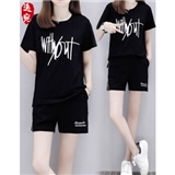 逸宛yw短裤女运动休闲套装女2020年夏装新款大码运动服时尚印花短袖短裤两件套跑步服女学生宽松套装 黑色 M【建议85-105斤】