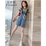 乐佐妮短裤女套装牛仔背带裤2020夏季新款条纹短袖T恤两件套阔腿裤 条纹+牛仔蓝 S