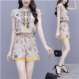 双合依恋 2020新款女装夏季职业装两件套裤复古宫廷风刺绣雪纺衫上衣阔腿短裤休闲时尚套装女 8380 黄色套装 M
