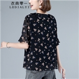 衣典零一 2020夏装新款夏季女装雪纺衫女时尚百搭韩版休闲宽松女士妈妈装印花短袖T恤衫女上衣衫衣小衫 黑色 XL