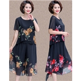 晳馥香中老年女装妈妈夏装两件套连衣裙女大码新款40岁50中年女装雪纺衫短袖t恤洋气套装 红花 (请拍对应尺码)