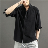 半双 短袖衬衫男2020夏季新款宽松大码中国风亚麻衬衣薄款男士休闲七分袖棉麻寸衫yym 黑色 M (建议100-115斤)