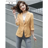 简草 小西装女2020秋装新款韩版时尚通勤简约气质百搭潮流格纹一粒扣七分袖西服外套女X8988 黄色 XL