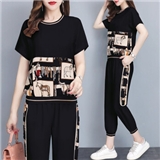 睡妍 大码女装套装女夏2020夏季新品韩版时尚套装减龄洋气宽松显瘦九分裤短袖休闲运动套装两件套女夏 黑色 L(98-110左右)
