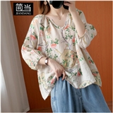 简当2020新款夏装加大码女装胖妹妹MM棉麻短袖宽松上衣单件上衣衬衫防晒衣T恤ZRK3061 花色 大码均码