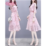 欧芙伦碎花雪纺连衣裙女2020夏季新款韩版时尚气质显瘦减龄收腰中长款裙子女5935 粉色 M