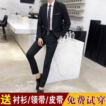 vocaco西服套装男修身三件套青年正装上班面试职业装学生青少年韩版潮流黑色新郎结婚礼服外套商务休闲 两粒扣黑色西服+西裤+白衬衫+领带 L/106-119斤