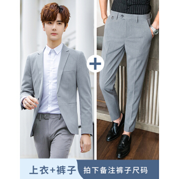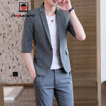 AEMAPE/美国苹果夏季西服套装男修身中袖小西装一套时尚休闲七分袖外套气质男装潮 926灰色套装(送T恤) XL 120-135斤