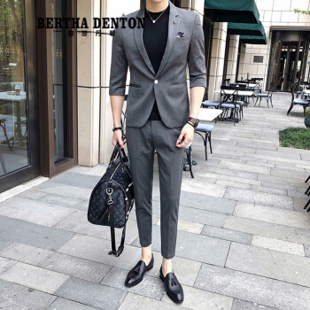 伯莎丹顿品牌夏季短袖痞帅小西装男外套2020新款修身垂感刺绣一套西服潮 中灰色【西装+西裤+黑色T恤】 XL